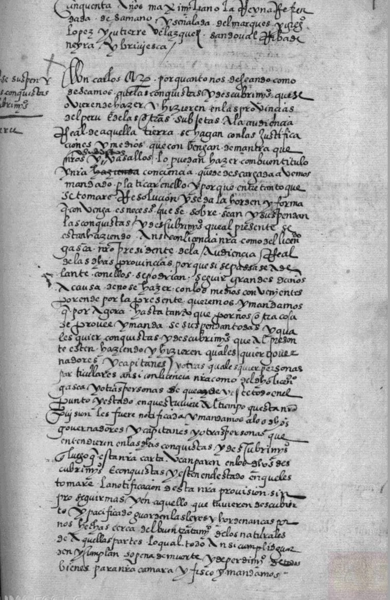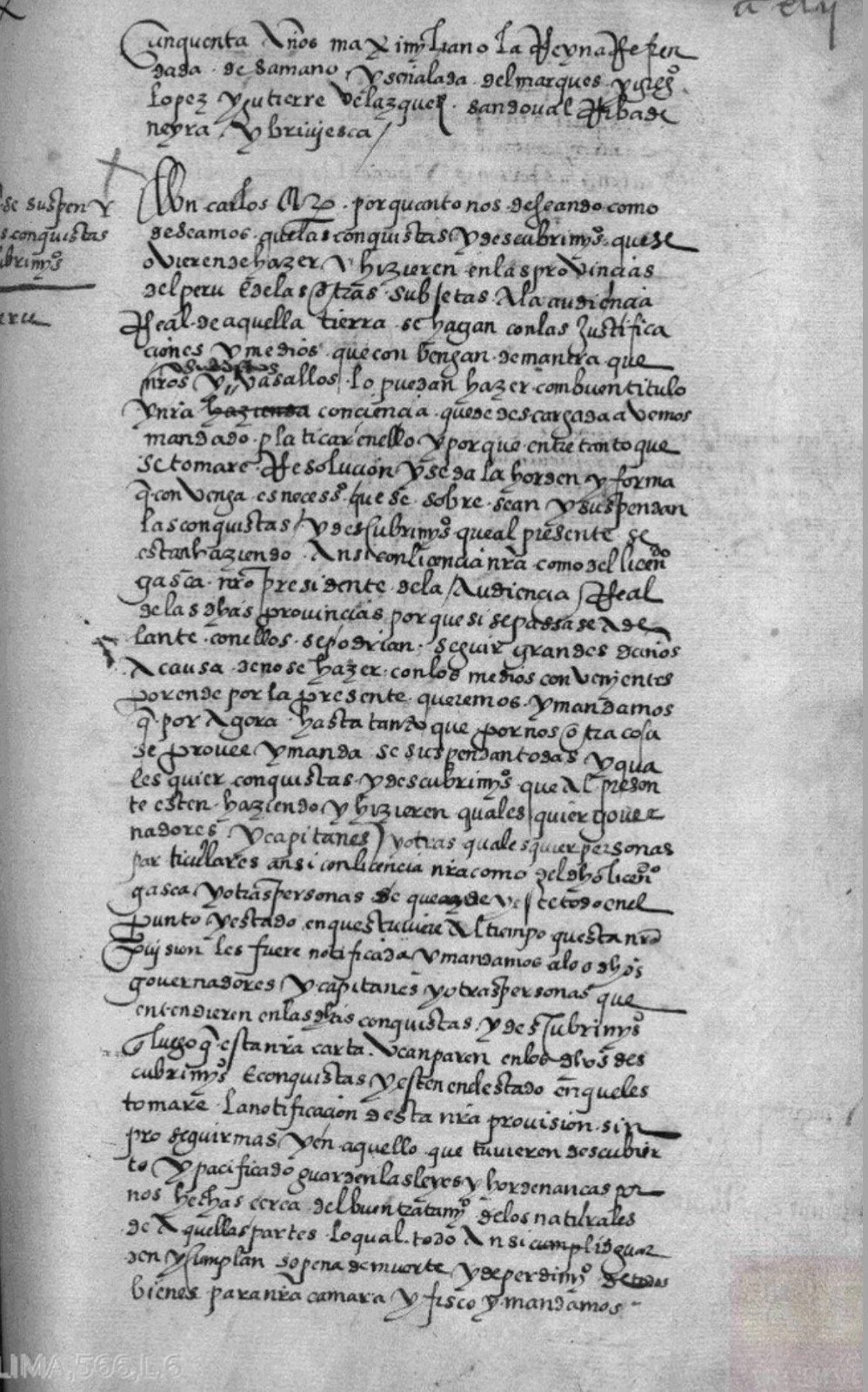 El documental nació como película histórica en formato de cortometraje, «que funcionó bien en varios festivales y fue premiado en el Festival de Cine Almirante Brown». Posteriormente, con el apoyo de Radio y Televisión Española y otras instituciones, permitieron realizar una intensa labor de búsqueda en archivos históricos, hasta hallar el documento que ordena parar la conquista en el Archivo de Indias y dar el salto al cine. El archivo redescubierto reza: «…se provee y manda se suspendan todas y qualesquier conquistas y descubrimientos que al presente estén haziendo y hizieren qualesquier governadores y capitanes y qualesquier personas particulares…».
