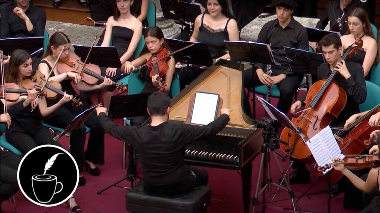El concertino da la nota a la formación, iniciando la contienda. El que pega primero, pega dos veces, debe haber pensado Salieri, que toma la delantera, e inicia el protocolar intercambio de caballerosas intenciones a través de las suaves notas del Allegro del Concertino da camera, que refrescan el aire de la tórrida tarde palaciega. Mozart, tenso, aguarda sonriente. Y, con la misma cortesía al llegar su turno, devuelve la gentileza con Andante en Do mayor.