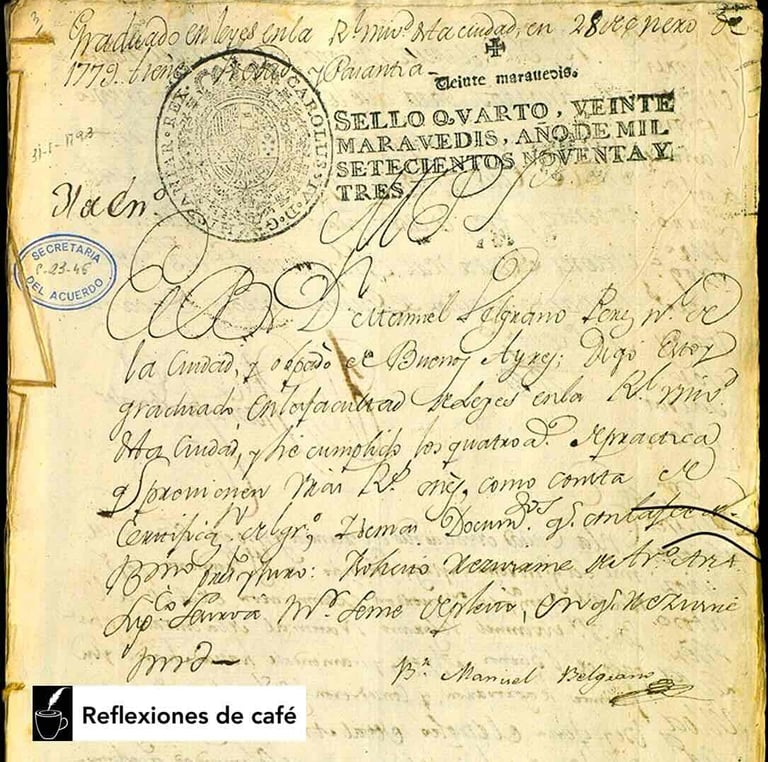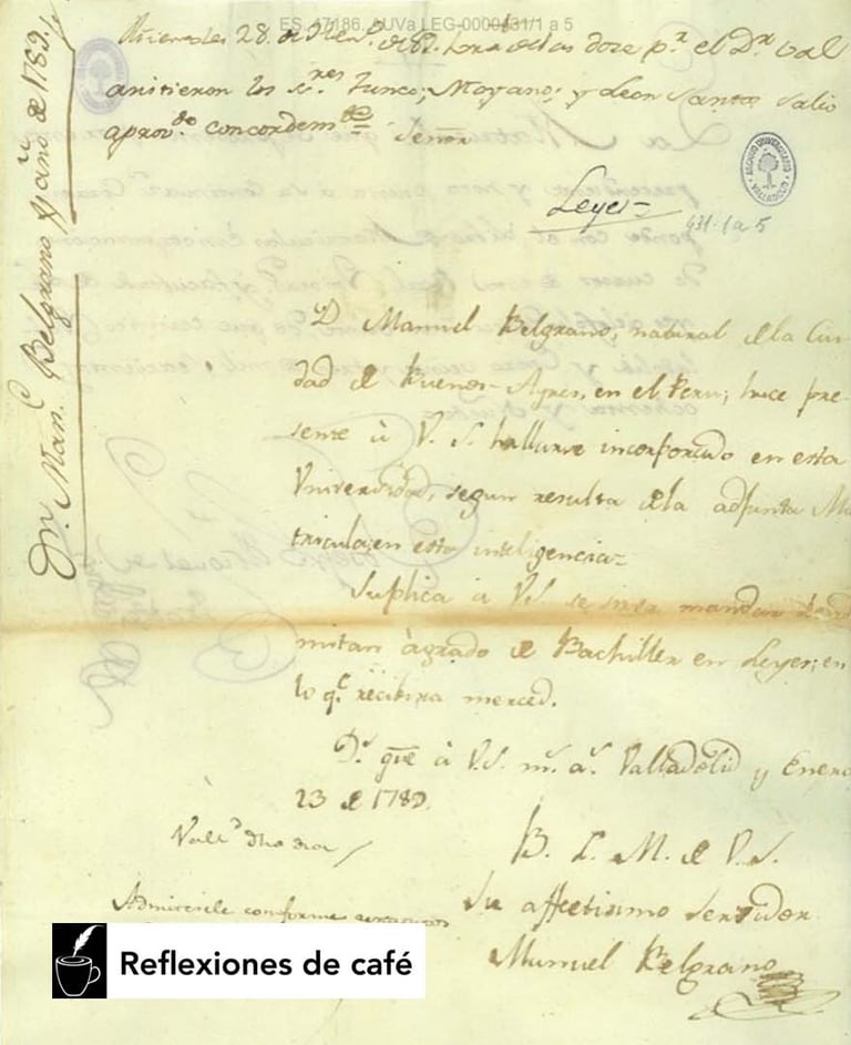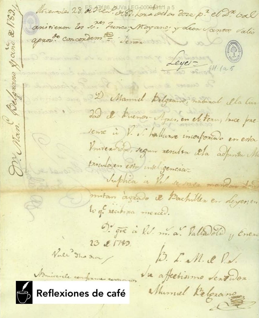 Tal vez la faceta menos conocida de este personaje extraordinario sea su paso por España a finales del S. XVIII. El hallazgo documental que nos ocupa lo ubica en el año 1793, tras completar sus estudios y graduarse en leyes por la Universidad de Valladolid, de colaborar en la defensa de su padre, acusado de malversación de fondos, y a punto de presentar la solicitud para examinarse y obtener la habilitación como abogado en la Real Chancillería de Valladolid. Este organismo de alto nivel judicial, similar al Tribunal Supremo de la actualidad, resolvía las apelaciones de grandes causas judiciales, desde finales de la edad media hasta 1834, contaba con el poder delegado directamente del rey para dictar sentencias en su nombre y su jurisdicción comprendía el norte de la corona de Castilla, desde el río Tajo. En la actualidad, el Archivo de la Real Chancillería de Valladolid se encarga de custodiar y difundir la documentación del tribunal. Cuenta con el fondo documental más extenso del antiguo régimen que existe en España, más de 15 km lineales de documentación, entre los que se halló el vestigio material que da testimonio del paso del prócer argentino por esta ciudad.
