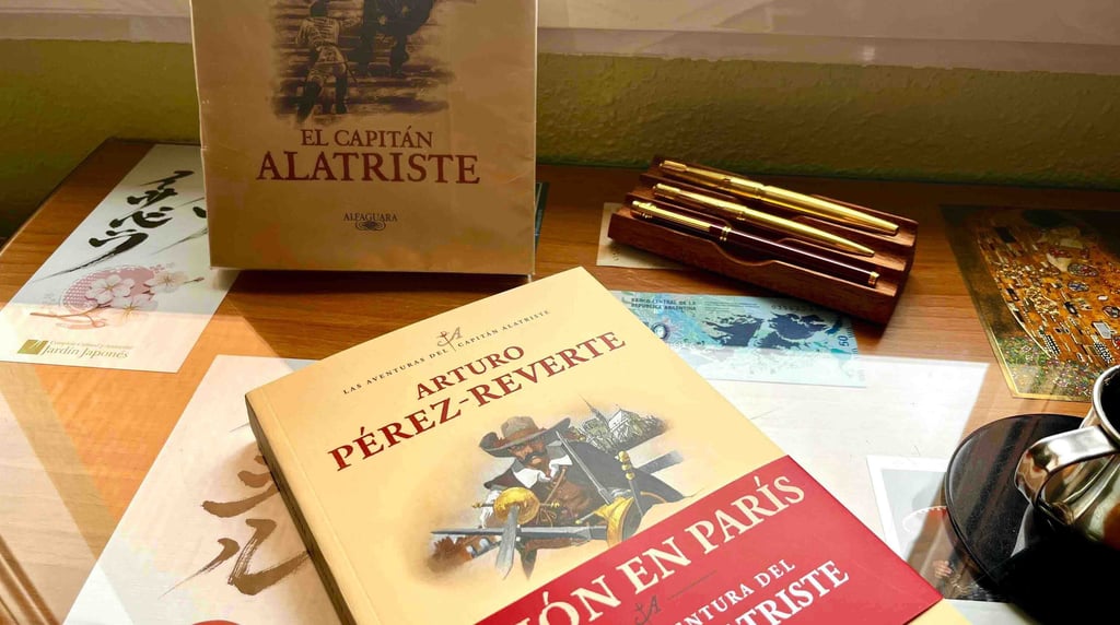 Alatriste vuelve a mi biblioteca, y con él, aventuras por la vieja Europa, horas de felicidad, y puede que hasta vuelva el adolescente que alguna vez fui. Observo al recién llegado, que reposa en mi escritorio, tocado con reluciente faja roja de soldado español. Unos centímetros más lejos, receloso, lo relojea el veterano de mil batallas y hojas amarillentas. Recuerdo haber empezado a leer aquel viejo libro sin entusiasmo, como a quien le mandan leer el Boletín Oficial del Estado o la guía telefónica, y recuerdo que algunas páginas más tarde ya no pude abandonar las calles del Madrid del s. XVII por las que la profesora de Lengua y Literatura, Cristina Charles, nos invitó a caminar.